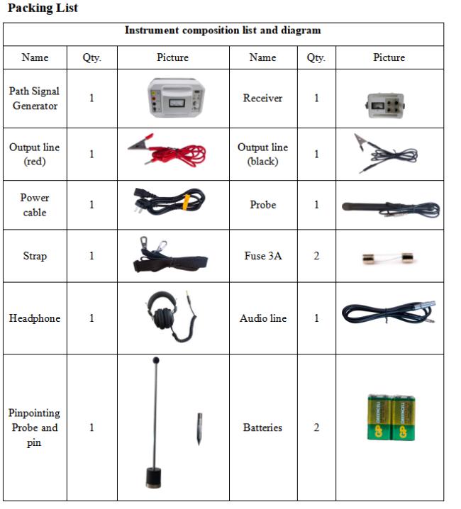 | Transport Package | Wooden Case Filled with Foam | Transmitter output frequency | 577Hz,815Hz,8kHz, 33kHz, 65kHz,82kHz, 133kHz, SS Low, SS High,multi-frequency mode. |